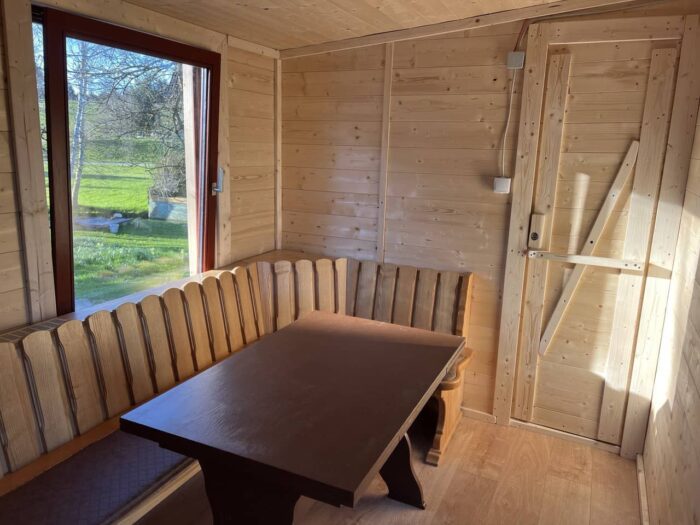 Der Aufbau ist eine Rahmenkonstruktion aus KVH 8×8. Wandaufbau von Innen nach Außen: 19er Fichte Vollholz Nut+Feder, Alu-Dampfsperre, Mineralwolle 80er, Unterspannbahn 150g/m2 als Dampfbremse, 3cm Hinterlüftung, Außenverschalung aus 19er Lärchebrettern. Das Dach besteht aus Trapezblech.