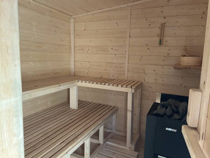 Im Aufenthaltsraum wurde zusätzlich Laminat schwimmend verlegt mit einer Kork Trittschalldämmung darunter. Die Hitzquelle des Saunaraumes ist ein 18kW Harvia-Holzofen inkl. 40kg Saunasteinen und einem Doppel-Edelstahlkamin, der gedämmt ist. Die BImSchV Stufe 2 ist erfüllt. Falls die Saunatür offen ist, wird der Vorraum mühelos mitbeheizt. Stromversorgung: 230V Landstromanschluss über Caravanstecker mit Adapter, 2 polige FI/LS Sicherung, 2 Lampen mit je einem Schalter und eine Steckdose.
